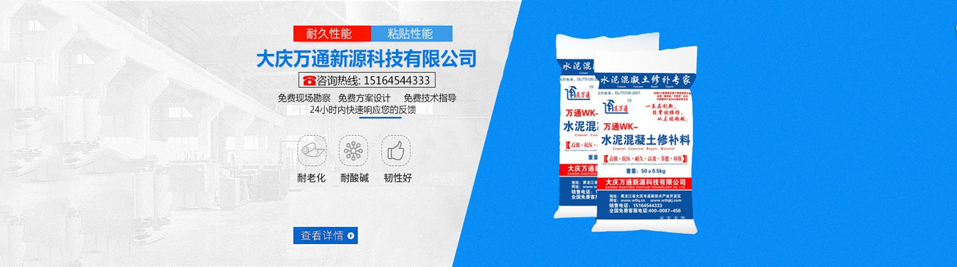 大慶萬通新源科技有限公司,是專業的"道路材料與養護方案集成商",是中國“專業水泥混凝土修補料材料供應商”,專注于高科技筑路新材料和道路養護新材料的研發、推廣、服務工作。公司可以提供系統解決水泥混凝土路面的麻面、空鼓、起皮、起砂、脫殼、露筋、掉皮、露石子、凍融、起粉、露骨、脫皮、鹽腐等病害的專業化公司。公司產品現已廣泛應用于公路、鐵路、水利、高速、國道、省道、縣鄉道路、市政、軍事等工程領域中,公司精干的服務隊伍和技術人員,可為工程施工提供有力的技術指導科學系統的解決方案。公司將不斷進行新材料、技術的研發和實踐,并聯合同行業的先進技術,發展成為公路建設和養護行業中,集材料、技 術、服務和方案集成化的專業機構,為提高公路建設質量、降低建設和養護成本提供更先進的材料、技術和方案。 公司先進的產品:直 接涂抹在病害部位即可,有好的抗壓抗折和粘接強度 ,可實現修補,和簡便的施工方法。在高速和高壓的行車狀態下不會出現破碎和脫落現象;修補后如新路面,不脫落不干縮開裂 。還具有好的抗凍、耐寒、防水、耐腐蝕和超長耐久性及抗紫外線特點。凡是水泥混凝土表面病害均適用于本材料。 萬通修補料具有: 使用壽命:較快的硬化速度和較高的早期強度,而后期強度無衰減,反而不斷上升,避免重載車輛通行碾壓造成局部路面二次破損。 抗壓能力:在高速和高壓的行車狀態下不會出現破碎和脫落現象,延長2倍的使用壽命 耐磨強度:后期強度不衰減、粘接強度大等因素使然,有很強的耐久性,對病害基本是一次性修補確保足夠的磨耗時間,避免修補周期太短。 粘接能力:同舊混凝土有較好的粘接結合強度,可以隨原路面一起伸縮、移動,從而避免了粘結失效和產生新破損。 實用性能:施工方便,無需開挖,節省了大量的施工費和材料費,延緩了道路病害的擴散和蔓延,延長了道路使用壽命。實現薄層修補,修補方法方便,快速,24小時快速通行,避免交通擁堵。節約成本,縮短工期解決了交通擁堵,延長2倍的使用壽命! 防水抗凍耐寒:有較強的水穩定性和凍穩定性可在-60℃—+60℃環境下不改變性能,適合各種氣候條件、水文條件和施工條件的地區使用。 熱脹冷縮系數一致:確保冷熱循環時與原來混凝土路面產生一致的不變化,防止熱脹冷縮系數不一致而造成粘結不牢,脫落,強度降低等。 適應氣候能力:萬通修補料適應于各種氣候條件,萬通立足北方高寒地區所以特別針對高寒地區 與高熱地區溫差變化大的氣候對材料的穩定性的影響有著多年研究和施工經驗。 耐酸鹽腐蝕:抗紫外線耐酸堿耐融雪劑的腐蝕。 美觀度:與舊混凝土有較好的相容性,萬通修補料與原水泥混凝土路面顏色接近,可根據原路面顏色調整材料顏色,達到好的顏色相容性,修補后有較好的美觀度。 水泥路面修補料、混凝土路面修補料、道路修補料,機場跑到修補,高速公路收費站修補,河道面修補,國道修補,鄉道修補。水泥地面起砂修補料、混凝土地面起砂修補料、水泥地面修補料、道路面層起砂修補料、水泥路面修補膠、水泥路面修補劑、混凝土路面修補膠、混凝土路面修補劑、道路修補膠、道路修補劑、水泥路面修補砂漿、混凝土路面,修補砂漿、道路修補砂漿。混凝土路面修補,水泥地面起砂處理劑,水泥地面起皮怎么辦,聚合物修補砂漿,修補混凝土路面,混凝土路面起砂修補,混凝土修補劑,水泥路面修補,水泥混凝土修補料,萬通水泥地面起砂怎么處理,混凝土表面缺陷修補材料,水泥地面起砂處理,混凝土路面修補,水泥地面起灰怎么辦,混凝土地面修補 ,水泥路表面大量起砂破損處理,水泥地面起砂怎么辦,修補混凝土,?萬通混凝土路面修補料,地面找平,地面起砂處理 ,地面起砂處理劑,水泥路面修補料,混凝土修補,混凝土路面起砂修補,萬通水泥地面硬化劑,混凝土露筋處理方案,混凝土路面薄層修補技術,水泥路面不平怎樣修補,混凝土缺陷修聚合物修補砂漿、水泥地面起砂的原因,張掖混凝土路面修補,水泥地面起砂怎么處理 ,混凝土修補方案,混泥土地面起沙,水泥地面地面返沙,水泥地起砂小竅門,修補混凝土用什么材料,小區單元門口路面修補,打水泥地面摻什么好看,水泥混凝土修補料,水泥路面損壞,混凝土蜂窩麻面修補,路面磨上水泥若起皮怎么辦,水泥路表面大量起砂破損處理,水泥地面起沙嚴重怎么辦,水泥地面不平怎么辦,水泥面起沙怎么辦,混凝土露筋修補方案,水泥地面處理方法,萬通水泥地起砂處理方法,水泥路面修補材料,水泥路修補價格,混凝土起砂怎么補救,混凝土地面強度時間表,水泥地拋沙怎么辦、地面起砂怎么處理,水泥地面起灰簡單辦法,地平起沙怎么辦,家里地面起沙,萬通蘭州混凝土路面修補、水泥路面快速修補料、水泥地面起砂處理劑,地面起皮的原因,混凝土起砂處理劑貴陽,水泥路起沙子怎么處理、路面修補料、地面處理,水泥路面起皮起沙修補料,混凝土路面起皮起沙修補料,水泥混凝土路面修補,道路快速修補材料,水泥路面修補料,水泥路面修補料,混凝土路面破損修補,混凝土路面起沙修補料,水泥路面起沙修補料,水泥路面破損修補,水泥路修補劑,混凝土路面起砂修補,水泥混凝土路面破損怎么修補,水泥路面修補料,混凝土路面修補,水泥路面修補,水泥路面起砂修補,混凝土路面修補劑,萬通水泥